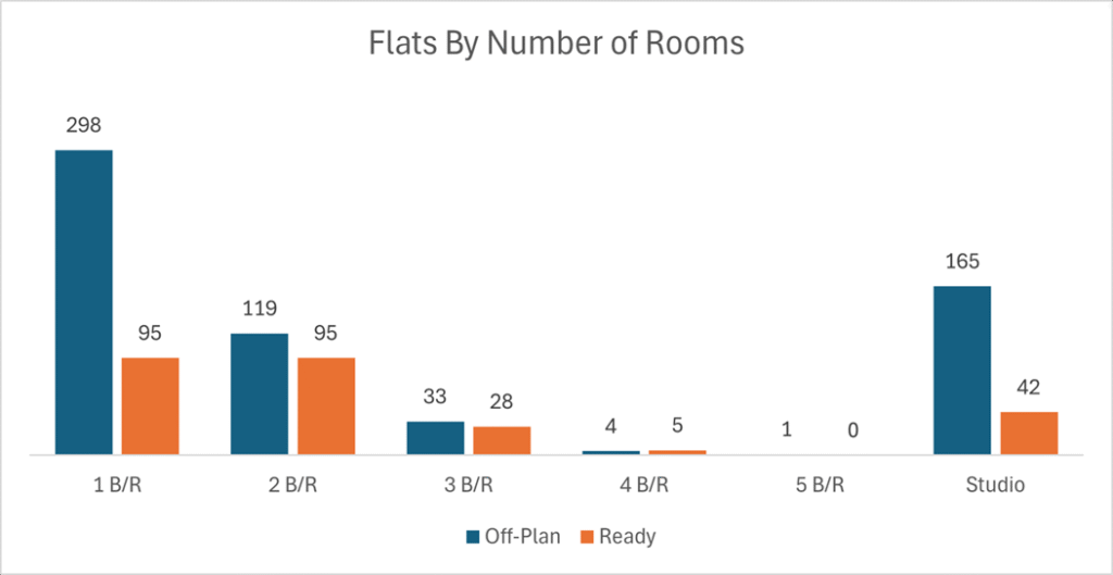 Within the ready market, flats led the activity, accounting for 57.5% of transactions. Villas represented 27.1% of Ready Properties transactions, followed by commercial units and hotel apartments.