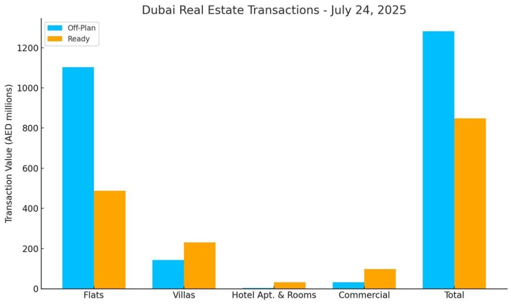 On 24 July 2025, Dubai’s real estate market recorded total transactions worth AED 2.13 billion, reflecting continued strength across both off-plan and ready property segments. The off-plan market accounted for AED 1.28 billion, making up 60.2% of the total, while ready properties contributed AED 848.4 million, or 39.8%.