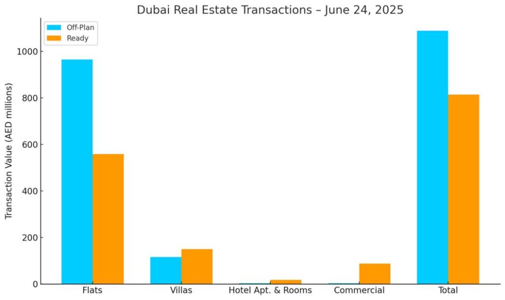 On 24 June 2025, Dubai’s total real estate transaction value reached AED 1.903 billion. Off-plan properties accounted for 57.2 % (AED 1.089 billion), while ready assets made up 42.8 % (AED 814 million) of the total volume.