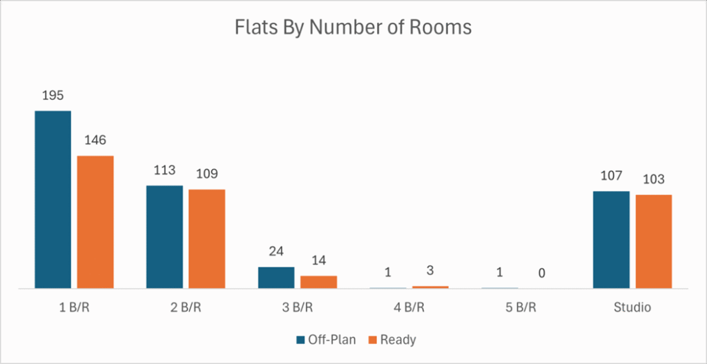 Off-plan’s majority share, centred on flats, reflects robust pre-completion appetite and flexible payment plans. The ready market’s higher villa and commercial contributions suggest strong immediate possession demand, both for owner-occupiers and landlords.