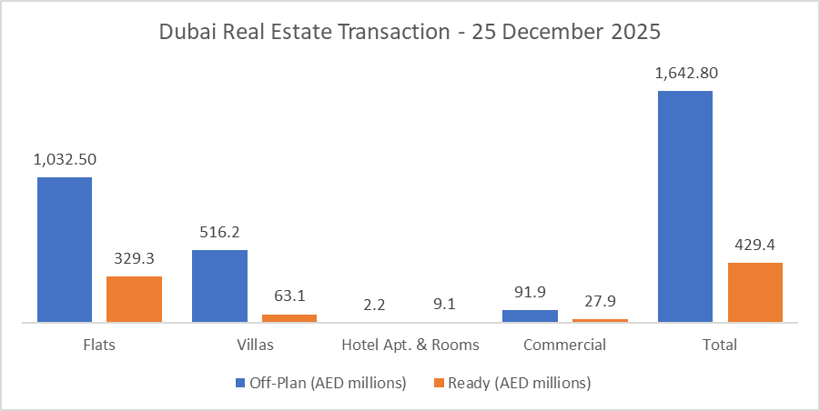 On the 25-Dec-2025, the total transacted value reached AED 2,072,138,933. Off-plan dominated with AED 1,642,773,139 (79.3%), while Ready accounted for AED 429,365,794 (20.7%).
