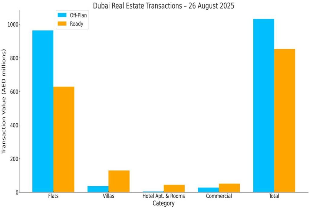 Dubai recorded AED 1.88bn in transactions. Off-plan led with AED 1.03bn (54.7%), while Ready logged AED 0.85bn (45.3%)—a balanced day with a slight off-plan edge.