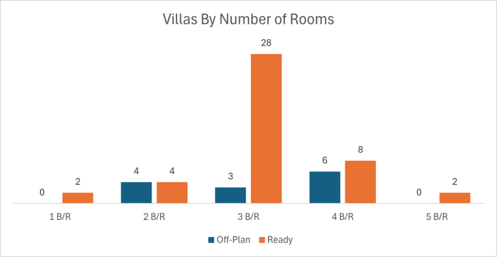 • Villas split: Villas were small in off-plan (3.6%) but more visible in ready (15.2%), suggesting end-user and upgrader activity in established communities.