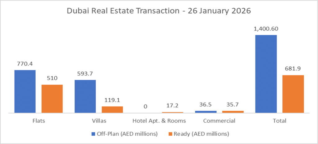 On the 26-Jan-2026, the total transacted value reached AED 2,082,531,866. Off plan dominated with AED 1,400,589,471 (67.3%), while Ready accounted for AED 681,942,394 (32.7%).