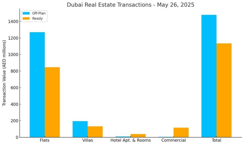 On 26 May 2025, Dubai’s total real estate transactions reached AED 2.6 billion, with off-plan properties accounting for 56.6% (AED 1.48 billion) and ready properties 43.4% (AED 1.14 billion) of the market.