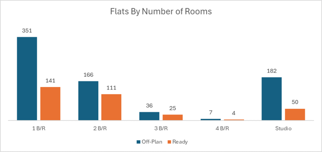 The market is still developer-led. Nearly 69% of all money spent went into off-plan, reflecting investor appetite for future delivery and flexible payment plans. The ready market remains active in immediately rentable apartments and income-yielding hospitality/commercial stock.