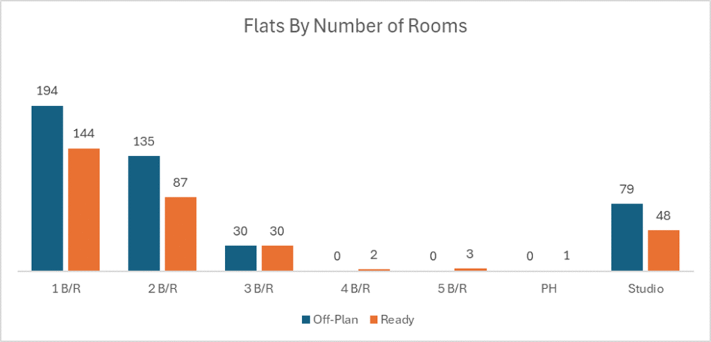 Off-plan activity was overwhelmingly flat-led, with villas providing a solid secondary layer and commercial adding a meaningful contribution.