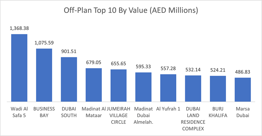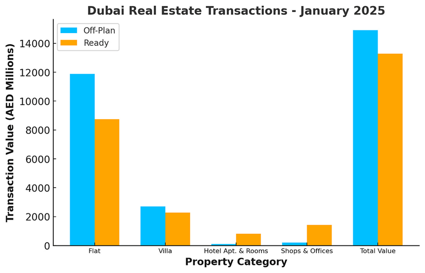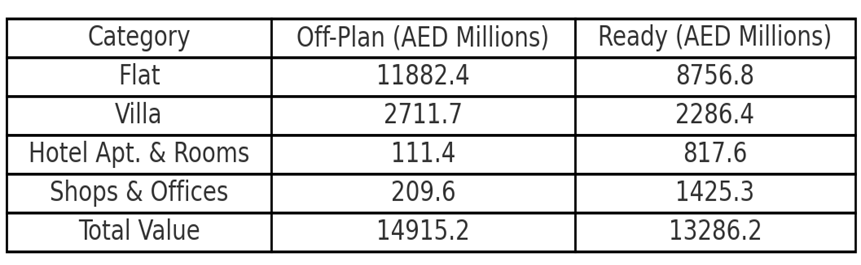 The off-plan segment accounted for AED 14.92 billion, with flats contributing the majority at AED 11.88 billion, followed by villas at AED 2.71 billion. Hotel apartments and commercial properties accounted for smaller portions.
