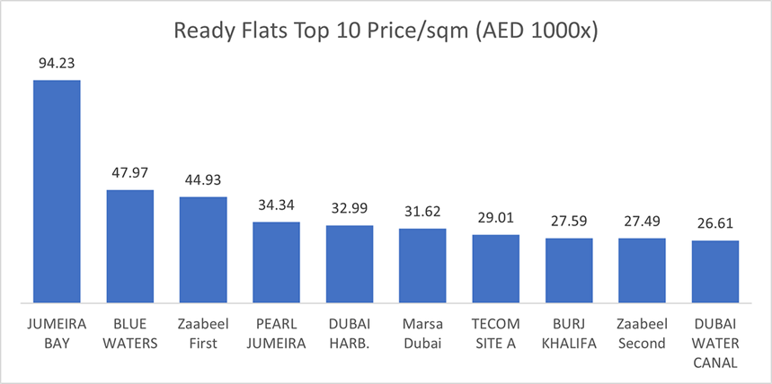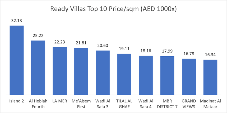 The average price per square meter for ready flats stood at AED 16,485, while ready villas averaged AED 15,096.