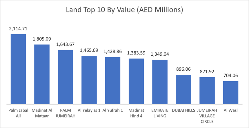Land transactions dominated the market with AED 24.73 billion in sales. The demand for prime land plots remains strong, particularly in high-profile locations.