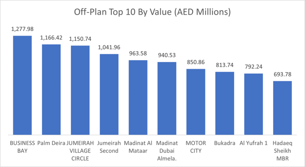 While JVC led in transaction count, Business Bay led in value, indicating higher ticket sizes and premium launches. Palm Deira and Jumeirah Second areas also featured prominently by value, underlining sustained luxury demand.