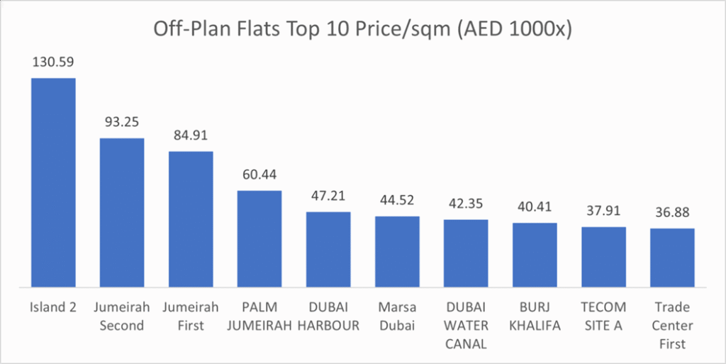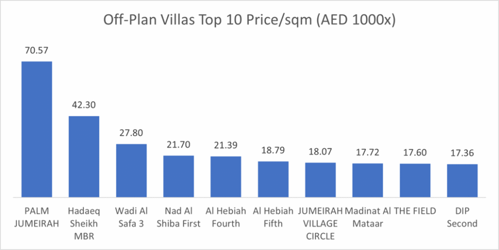 The average price per square meter for off-plan flats stood at AED 24,742, while off-plan villas averaged AED 17,529 both numbers slightly declined from last month.