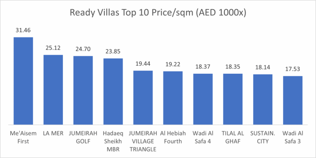 The average price per square meter for Ready Flats stood at AED 15,572, while Ready Villas averaged AED 13,424 almost unchanged from last month.