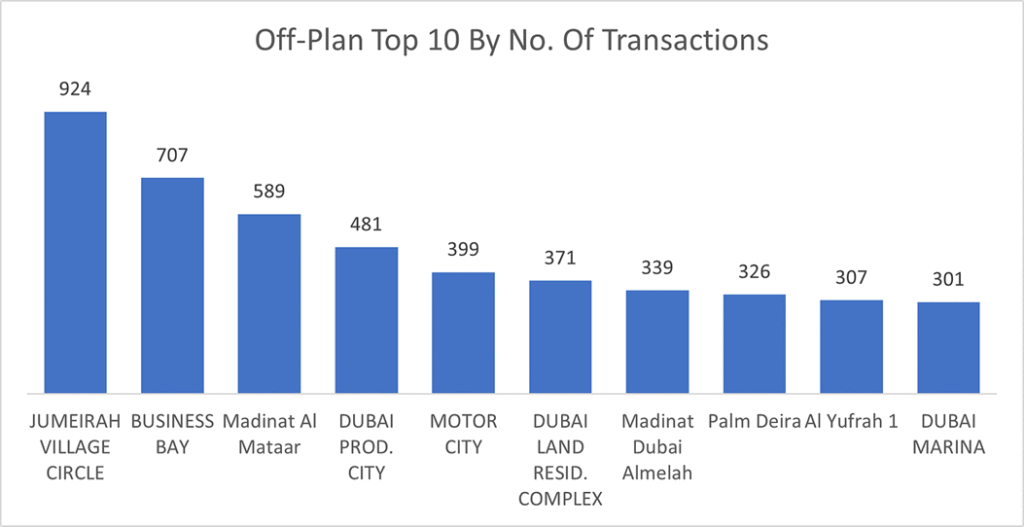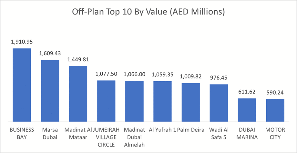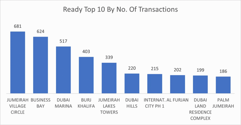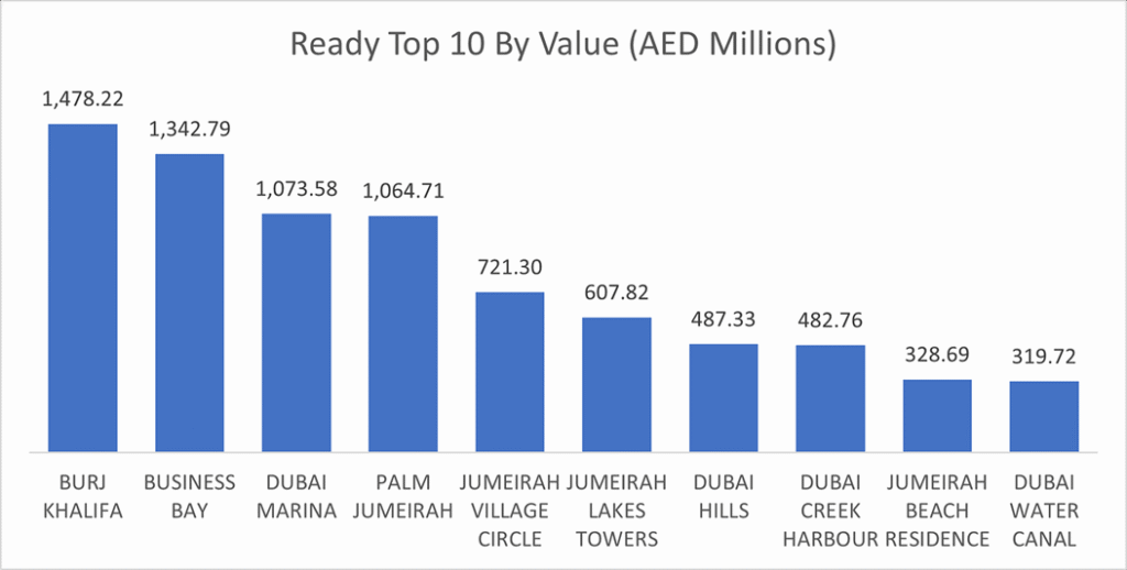 In the ready market, premium and iconic locations took center stage. Burj Khalifa led the pack with over AED 1.4 billion in transactions, reflecting its enduring appeal. Business Bay again appeared as a top performer, highlighting its balanced mix of luxury residences and commercial offerings.