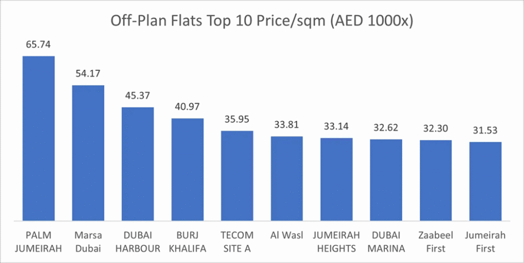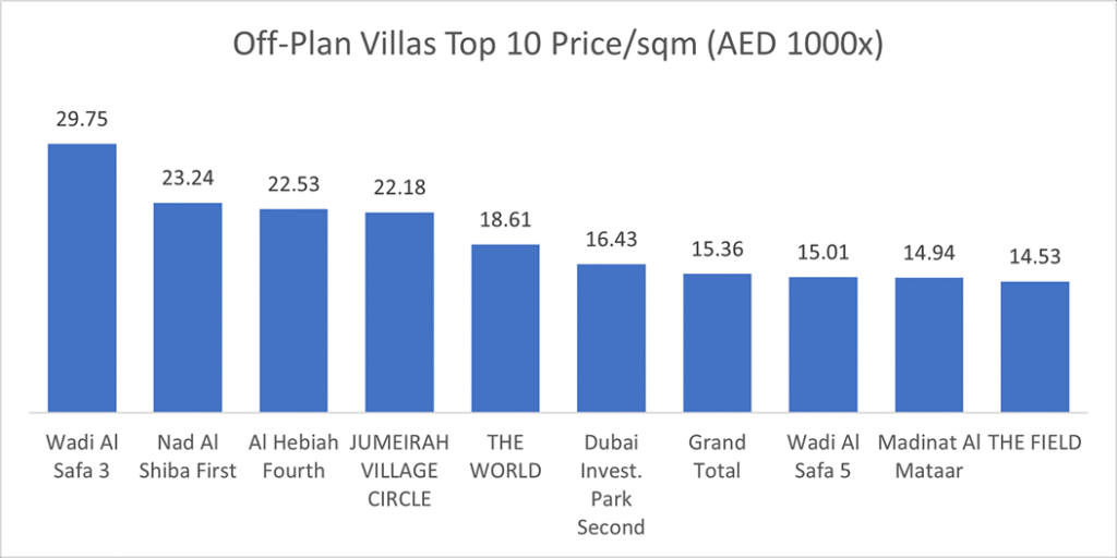 The average price per square meter for off-plan flats stood at AED 24,058, while off-plan villas averaged AED 15,358.