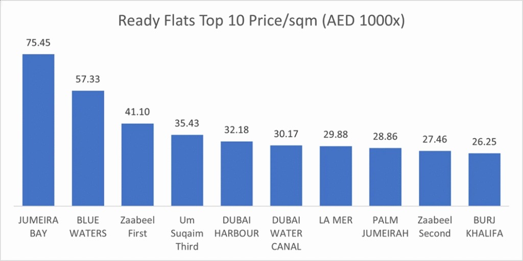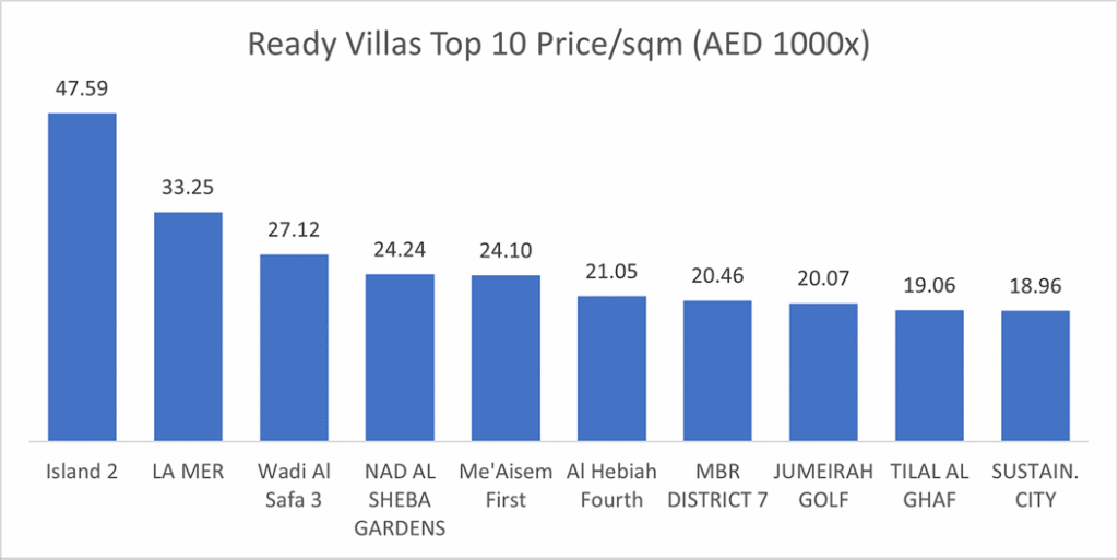 The average price per square meter for ready flats stood at AED 17,139.59, while ready villas averaged AED 13,792.16.