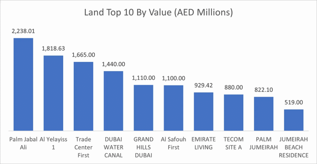 Land continued to dominate the market with a total transaction value of AED 27.35 billion, representing a commanding 45% share of the overall market. This surge underscores the increasing activity from institutional investors and developers who are positioning themselves for long-term growth through large-scale or master-planned projects.