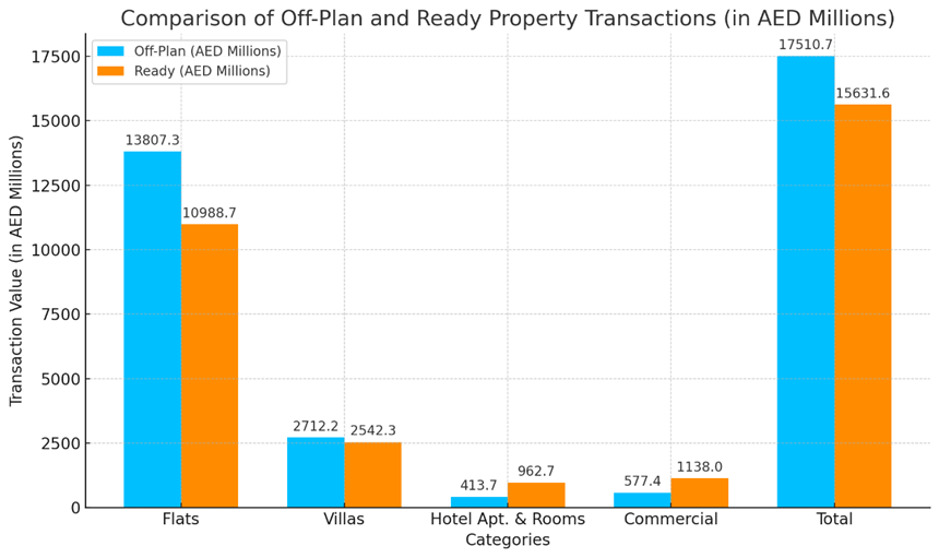 Ready properties contributed AED 15.6 billion to the total. Flats once again dominated, with AED 11.0 billion in value, while villas accounted for AED 2.5 billion. Hotel apartments and rooms registered AED 962.7 million, and shops and offices reached AED 1.14 billion. The ready market’s performance indicates steady end-user and investor interest in immediately deliverable units. - Land Transactions: