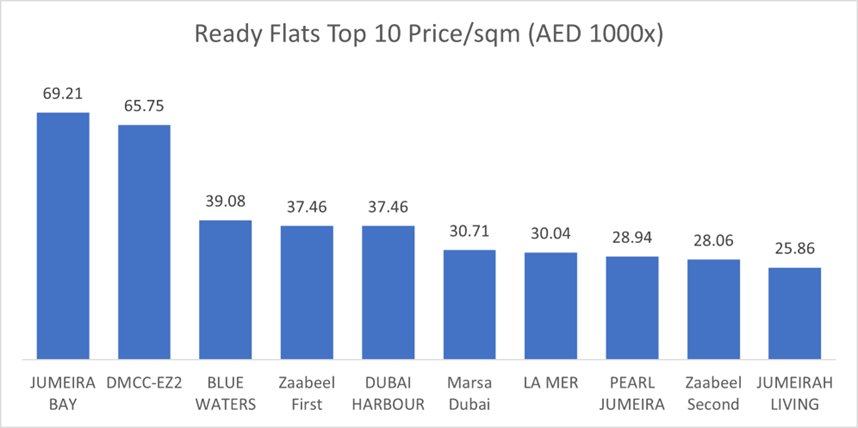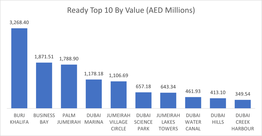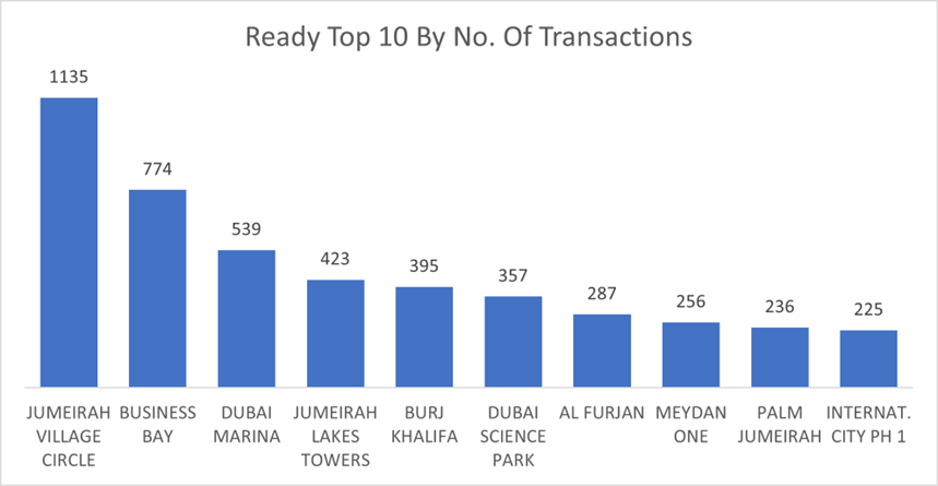 • Top 10 by Number of Transactions: Jumeirah Village Circle witnessed the highest number of transactions (1,135), followed by Business Bay (774) and Dubai Marina (539). These areas are popular among both investors and end-users, indicating sustained demand for ready properties in established communities.