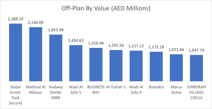 • Top 10 by Value: Dubai Investment Park Second topped the list with AED 2.29 billion, followed closely by Madinat Al Mataar at AED 2.15 billion. Other high-value areas included Hadaeq Sheikh MBR (AED 1.85 billion) and Business Bay (AED 1.33 billion), highlighting strategic locations that attract high-value transactions.