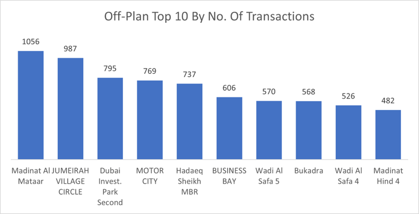 • Top 10 by Number of Transactions: Madinat Al Mataar led with 1,056 transactions, followed by Jumeirah Village Circle (987) and Dubai Investment Park Second (795). These areas showcase strong activity, particularly for residential and mixed-use developments.