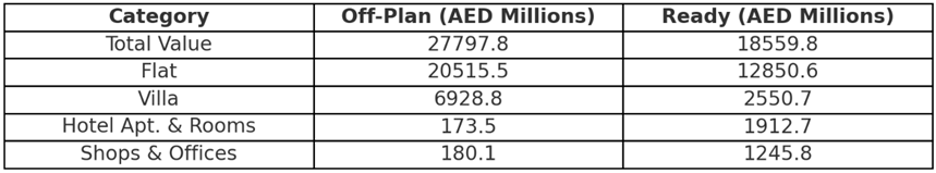 The ready property market displayed consistent demand, with flats comprising the largest portion of sales at AED 12.9 billion. Villas, hotel apartments, and commercial units also contributed notable values, showing balanced demand across residential and commercial ready properties.