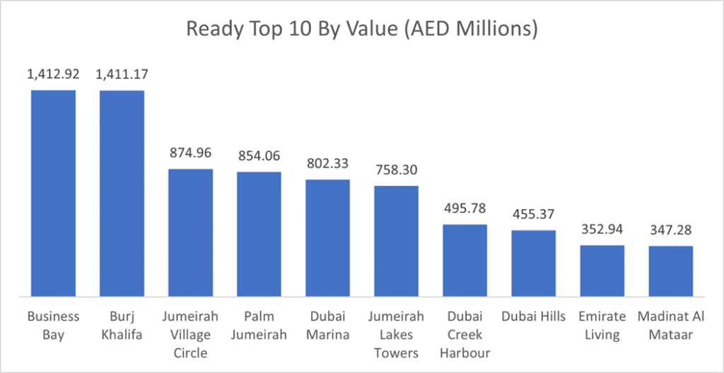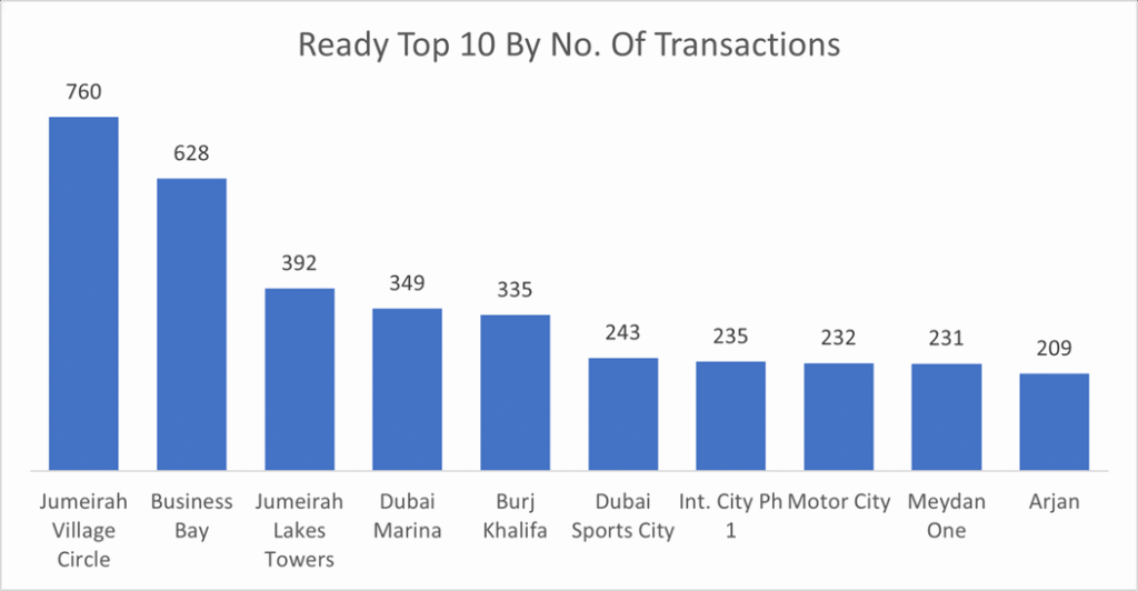 In the ready market, Business Bay topped the chart in the value traded while JVC booked secured the first place in number of transactions, both areas combined saw more than 16% of the secondary market traded value.