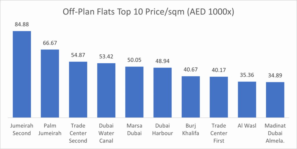 The average price per square meter for off-plan flats stood at AED 23,580 almost unchanged from last month, while off-plan villas averaged AED 20,007 less than 1% increase from last month.