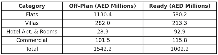 The off-plan segment recorded AED 1.54 billion in transactions, with the following distribution across asset types: