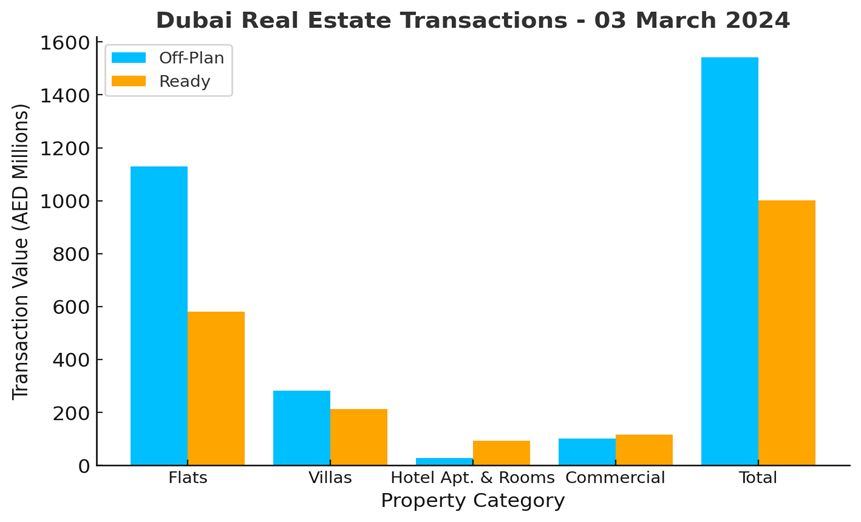 Dubai’s real estate market continues to demonstrate robust activity, with total transactions reaching AED 2.54 billion on March 3, 2024. This includes both off-plan and ready property transactions, reflecting strong investor confidence in both new developments and completed properties.