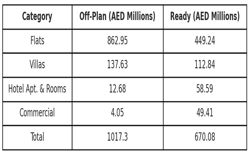 Total off-plan sales reached AED 1.02 billion, representing the majority of transactions. The category breakdown reveals: