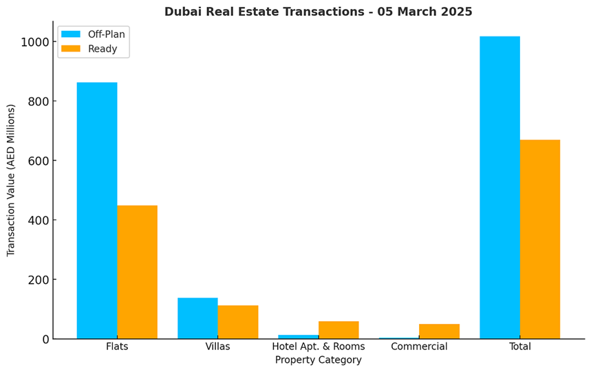 Dubai’s real estate market recorded total transactions worth AED 1.69 billion on March 5, 2025, highlighting continued investor interest in both off-plan and ready properties. Off-plan transactions dominated the market, accounting for 60.3% (AED 1.02 billion) of the total value, while ready property sales contributed 39.7% (AED 670.08 million).