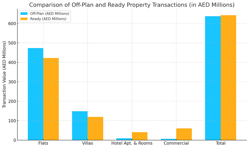 - Flats: AED 474,056,275 (74.3% of off-plan transactions)
