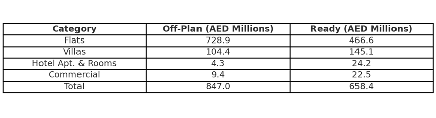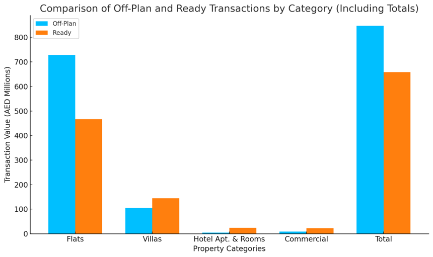 - Villas: AED 145,145,811 (22% of ready total) – Villas also showed strong performance in the ready market, underscoring demand for premium living spaces.