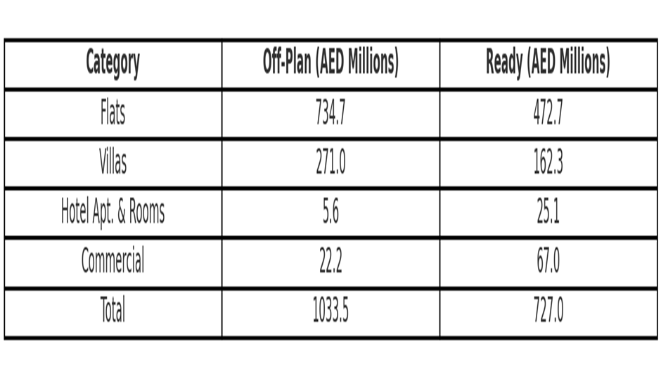 The ready property segment reached AED 727 million, constituting 41.3% of the total transactions, reflecting sustained investor interest in completed, move-in-ready properties. The breakdown of this category is as follows:
