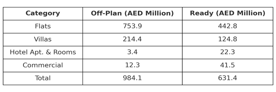 The dominance of off-plan properties demonstrates strong investor confidence in future developments, while ready properties maintain their appeal for immediate use and investment returns.