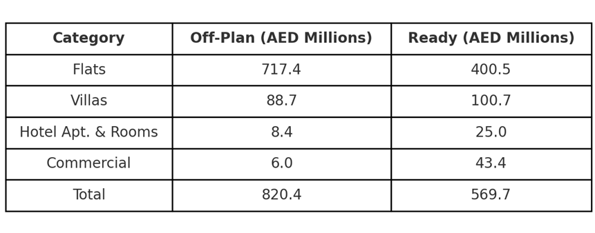 The total transaction value for off-plan properties was AED 820,436,639, distributed across the following sub-categories: