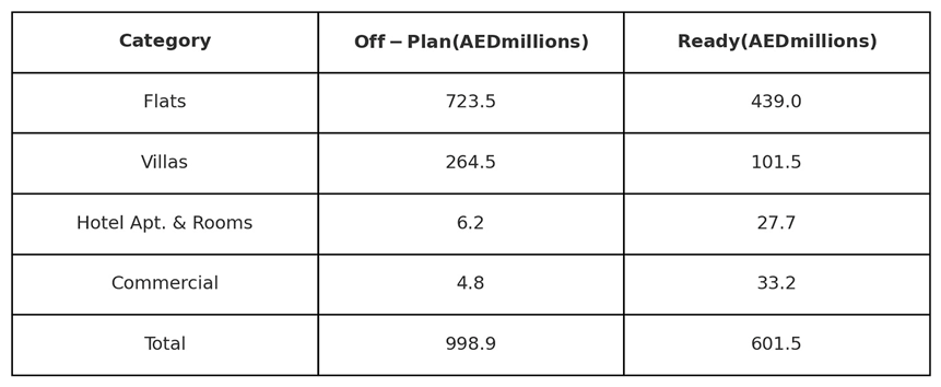 • Flats: AED 439,025,263 contributed a substantial 73.0% to the total ready segment, reflecting high demand for immediately available residential units.