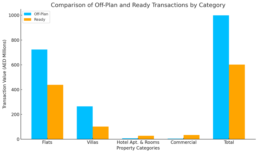 The ready property category contributed AED 601,452,055, which constitutes 37.6% of the total transactions. Sub-category contributions include: