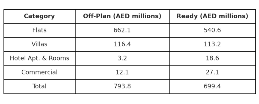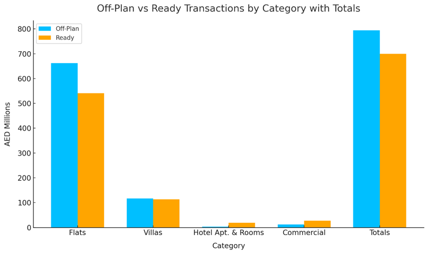 Ready properties accounted for 46.8% of the total, reaching AED 699.4 million. The sub-category contributions are: