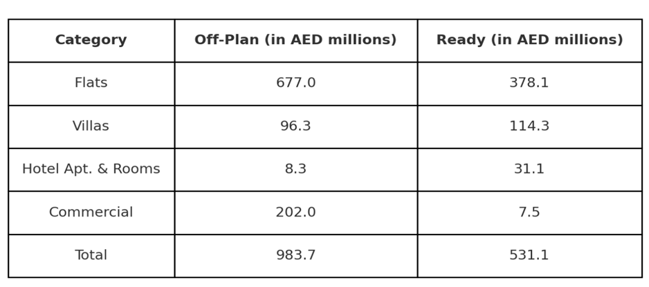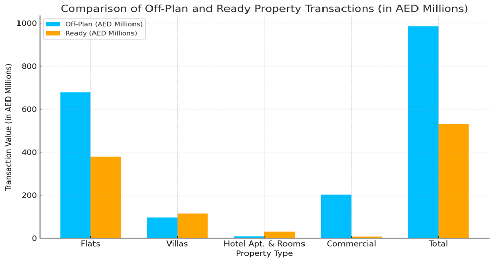 Commercial Properties recorded AED 7.55 million in transactions, representing a modest 1.4% of the ready property segment, suggesting that businesses are more focused on new commercial developments.