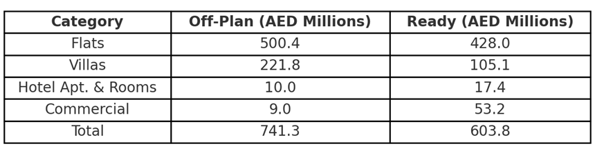 - Flats: AED 500,433,601 (67.5% of off-plan transactions)