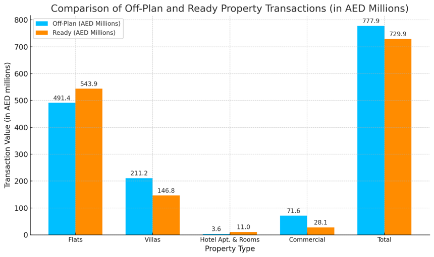 - Flats: Flats dominated the ready market with AED 543,938,528, contributing 74.5% to the ready property category. This reflects a significant preference for move-in-ready homes, catering to both residents and investors.