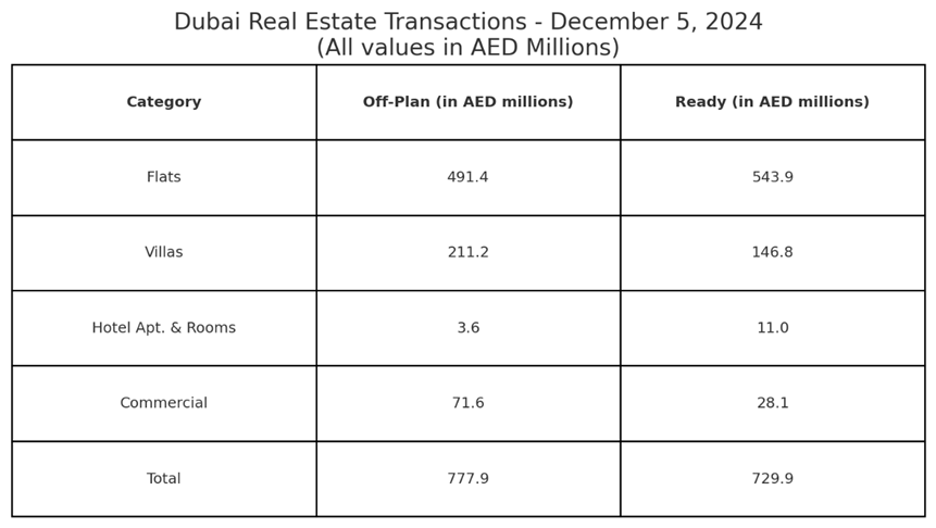 The Dubai real estate market continues to showcase remarkable dynamism, with total transactions recorded at AED 1.51 billion on December 5, 2024. This report delves into the details of both off-plan and ready property sales, breaking down their contributions and providing an insight into the various property types.