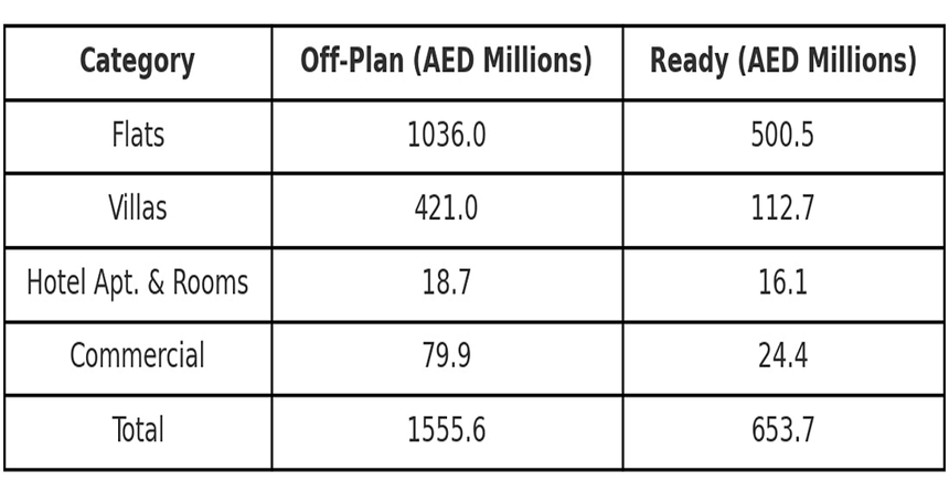 - Ready Properties: AED 653.65 million, accounting for 29.6% of the total market activity.