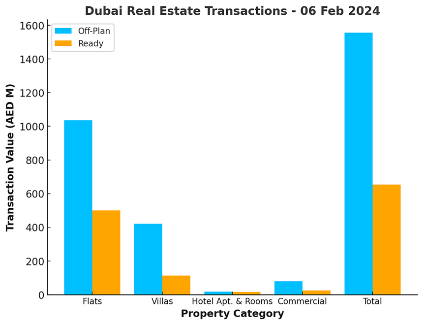 Dubai’s real estate market recorded an impressive AED 2.21 billion in transactions on February 6, 2024, reflecting sustained investor confidence across both off-plan and ready properties. The market continued to see strong activity, with off-plan properties dominating the transactions, highlighting a preference for future-ready developments.