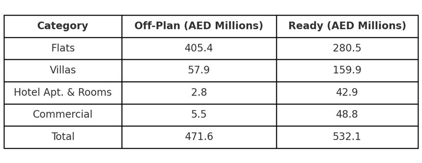 • Flats: AED 405,379,149 (86% of off-plan transactions)