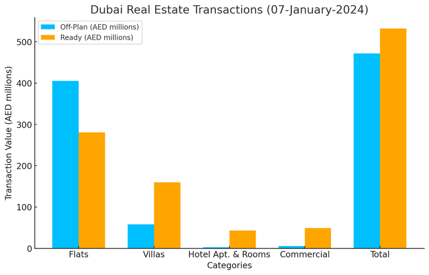 Conclusion The 7th January 2024 transactions reveal a dynamic and thriving real estate market, driven by a mix of off-plan ambition and ready property reliability. With nearly equal contributions from both segments, Dubai continues to cement its position as a global hub for real estate investment. Buyers and investors can look forward to sustained growth, supported by Dubai’s strategic developments and growing global appeal.