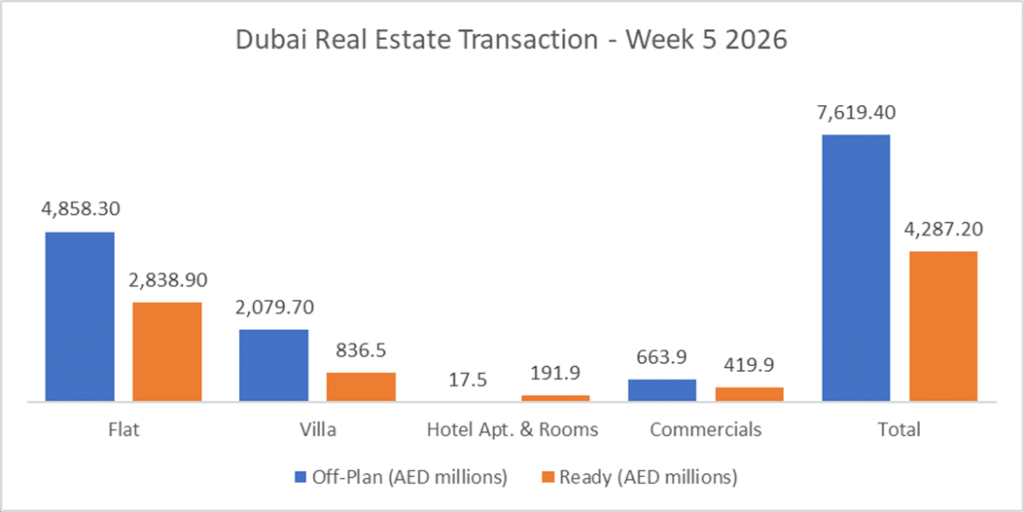 In Week 5, total trading reached AED11.91bn across 5,114 transactions. Off-Plan dominated with AED7.62bn (64.0%), while Ready accounted for AED4.29bn (36.0%).