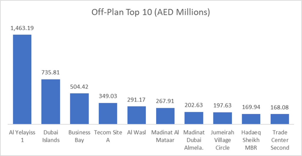 The top 10 off-plan areas totalled AED4.35bn, representing 57.1% of all Off-Plan value (and 36.5% of the entire week).